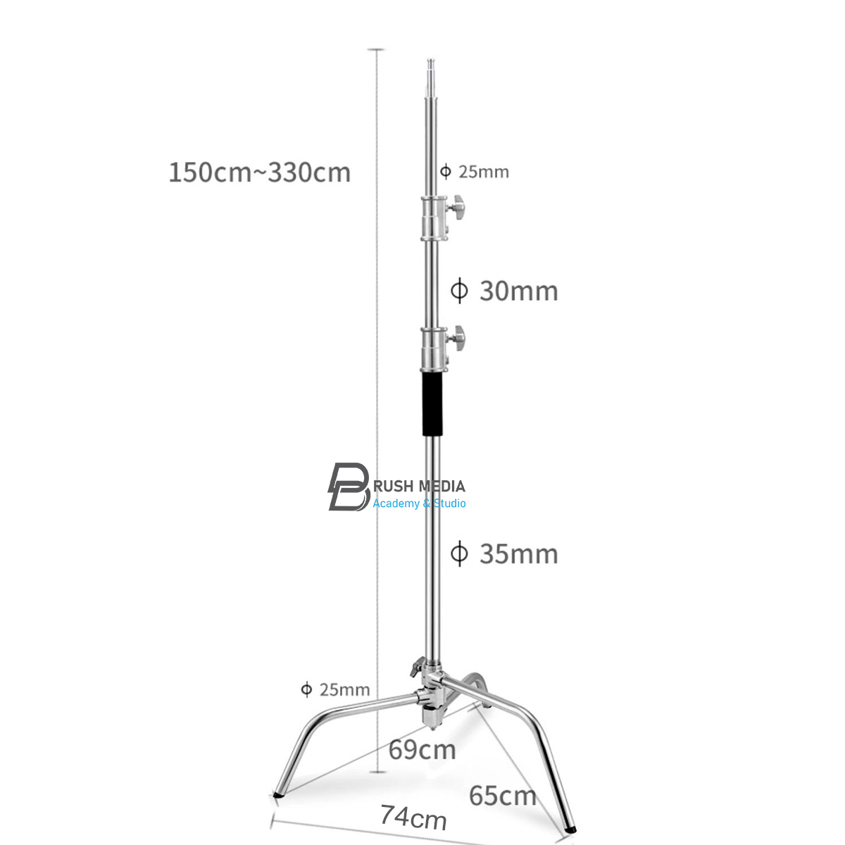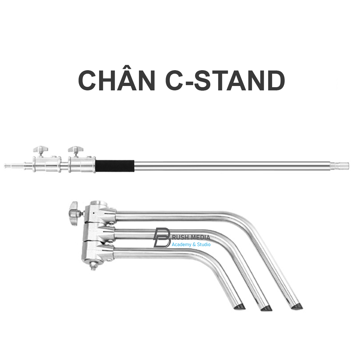 Chân C-stand có thể điều chỉnh độ cao linh hoạt từ 150cm đến 330cm, giúp phù hợp với nhiều mục đích sử dụng khác nhau. Ống chân có đường kính lần lượt 35mm, 30mm và 25mm, đảm bảo độ chắc chắn tối đa. Tay Boom dài 128cm, đường kính 16mm, đi kèm hai củ cờ giúp cố định chắc chắn, thuận tiện khi sử dụng với các loại phụ kiện như đèn studio, phản sáng, phông nền.